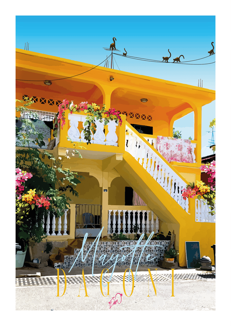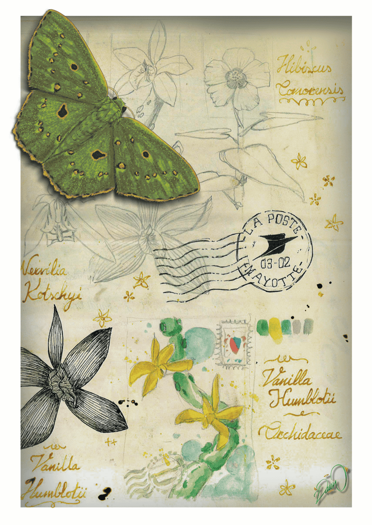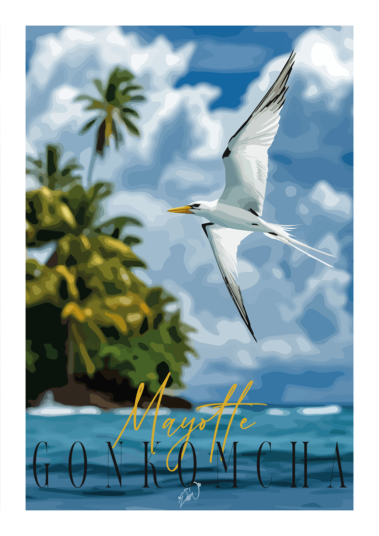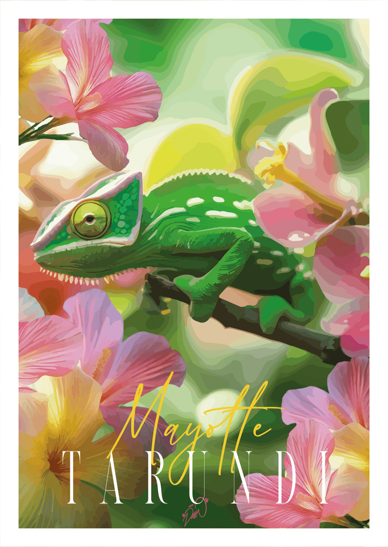 Série d'impressions fines mêlant faune, flore et cultures traditionnelles de l'île de Mayotte. Ratio 2:3 sur papier 200g/m². Conception entre dessin, Procreate & Adobe Illustrator.